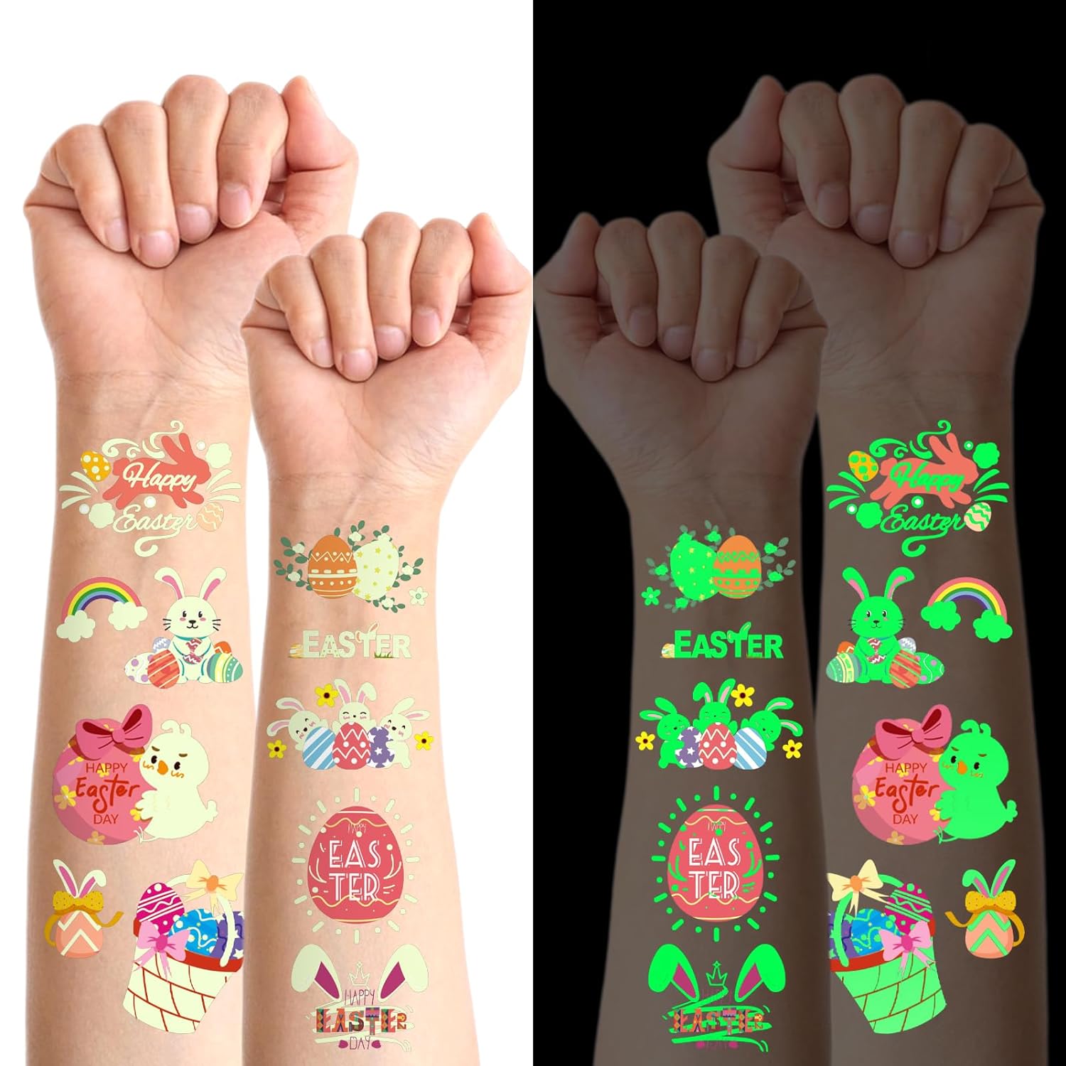 ☀️Luminous Easter Design : You will receive 36 sheets glow tepmorary tattoos with rabbits, Easter eggs, flowers, chicks favorite patterns that kids will love! Each sheet measures 4.72 " x 2.95 ". After absorbing light and sunlight, this tattoos will glow in the dark.