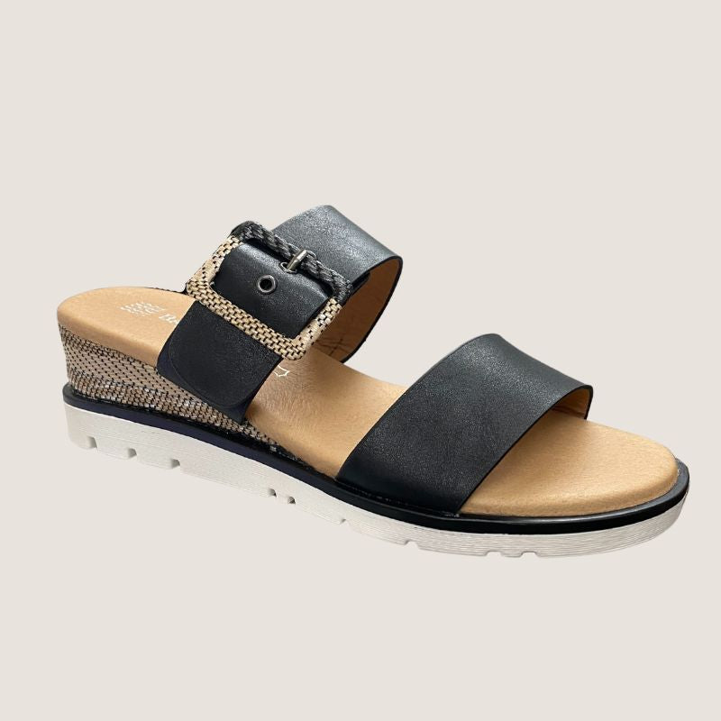 The Bay Lane River slides feature a wedge heel, a soft padded sole, and a fabric detail around the heel. Slip these on and you are ready for your day in style.